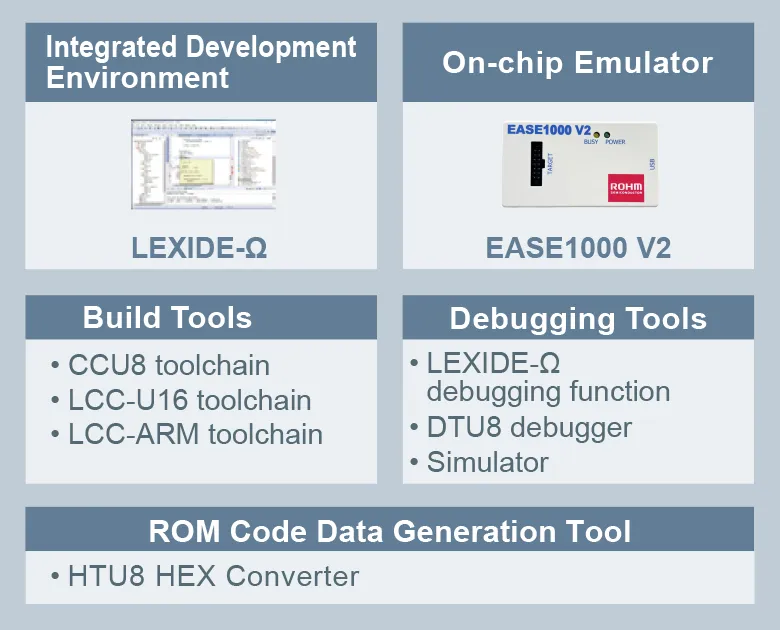 • LAPIS Development Tools LEXIDE-Ω is the application program developing environment for LAPIS Technology 8-bit RISC processors based on the nX-U8/100 core or 16-bit RISC processors based on the nX-U16/100 core, and for ROHM microcontrollers based on the Arm® Cortex®-M core.