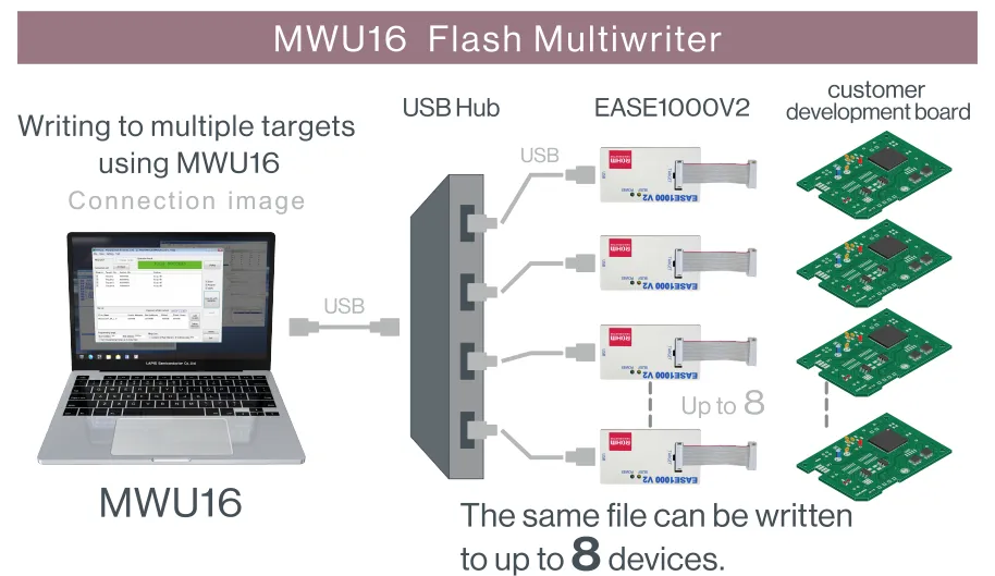 • Supports writing program files to multiple (up to 8) target Flash memory of the same type.