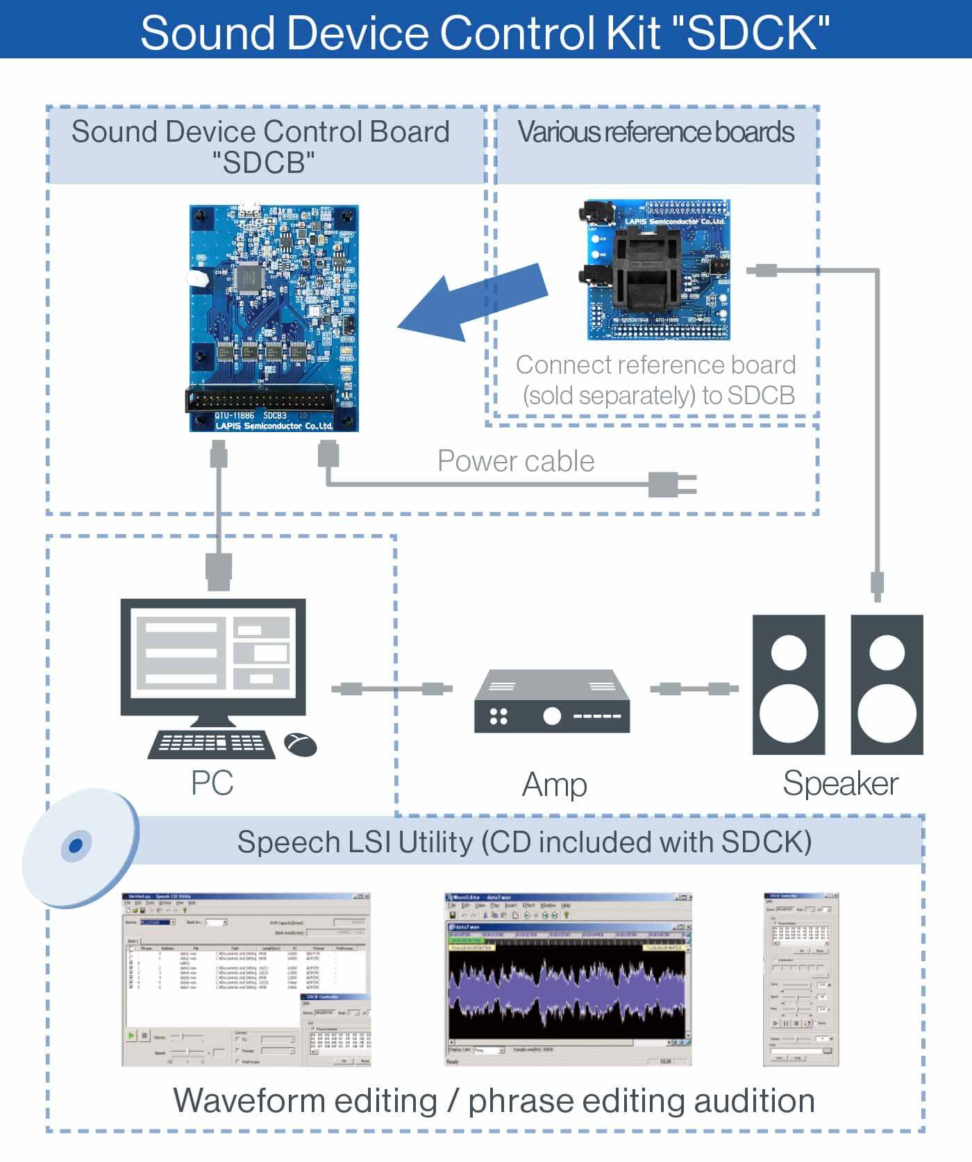 This tool is for writing data to the Speech Synthesis LSI on the reference board via the following hardware SDCB, and for listening.