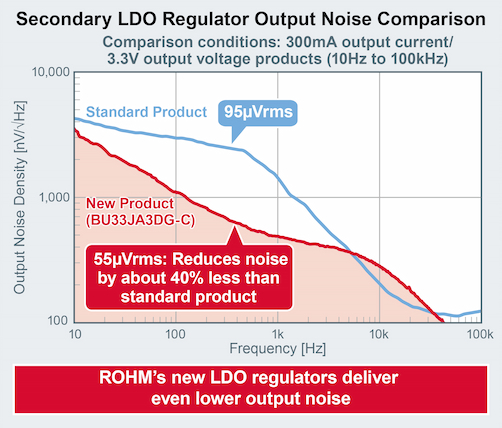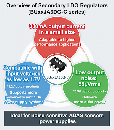 The new BUxxJA3DG-C series meets the basic requirements for LDOs used in the secondary power supplies of automotive systems (i.e. compact size, compatibility with standard output voltages). On top of that, despite their small package size (2.9mm × 2.8mm), they support output currents of up to 300mA while covering an input voltage range from 1.7V to 6V. Such low input supply voltage enables the use of the LDO in 1.8V power supply systems to provide low output voltages at a higher efficiency. Furthermore, the output voltage noise is reduced to just 55μVrms which is about 40% lower than similar 3.3V low-noise LDO regulators. As a result, its series is able to provide a more quiet power supply along with greater miniaturization and performance in ADAS applications.