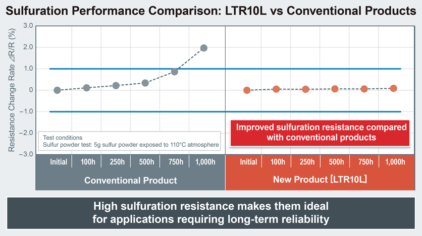 LTR10L is a 0508-size (0.5inch × 0.8inch) / 1220-size (1.25mm × 2.0mm) model with an industry-leading rated power of 1W. The lineup includes high accuracy (D Class) products that provide a resistance tolerance of 0.5% along with class-leading TCR, making them ideal for automotive LED headlamps and other applications requiring high accuracy current detection. At the same time, high sulfuration resistance enables suitability with telecommunication base stations requiring long-term reliability even when operating continuously in harsh outdoor environments and automotive powertrain where sulfuration from exposure to exhaust gases is a concern.