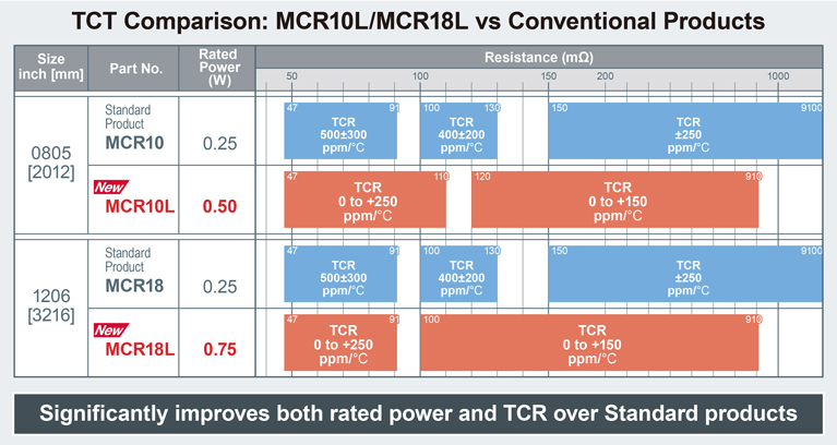 The MCR10L (0.5W rated power) and MCR18L (0.75W rated power) are low-resistance models in the general-purpose MCR series. Power rating is not only significantly improved, but TCR as well compared with the conventional 0.25W rated MCR10 and MCR18. Additional updates include a revised element structure and materials that increase performance and allow us to continue to ensure stable supply.