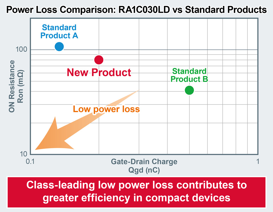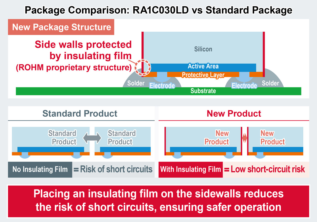 The RA1C030LD is offered in the DSN1006-3 wafer-level, chip-size package (1.0mm × 0.6mm) that takes advantage of ROHM’s proprietary IC process to achieve low power dissipation together with greater miniaturization. In terms of the figure of merit that expresses the relationship between conduction and switching losses (ON-resistance × Qgd), an industry-leading value has been achieved that is 20% lower than standard package products in the same package (1.0mm × 0.6mm or smaller), contributing to a significantly smaller board area along with higher efficiency in a variety of compact devices. At the same time, ROHM’s unique package structure provides insulated protection for the side walls (unlike standard products in the same package with no protection). This reduces the risk of shorts due to contact between components in compact devices that must resort to high density mounting due to space constraints, contributing to safer operation.