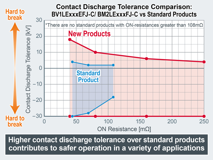 A wide range of ON-resistance values (40/80/160/250mΩ) in both 1 channel and 2 channel configurations are offered to meet diverse customer needs. Furthermore, the contact discharge tolerance of all the products in the family is higher than that of other standard products. This adds to a safer operation inside various electronic equipment types.