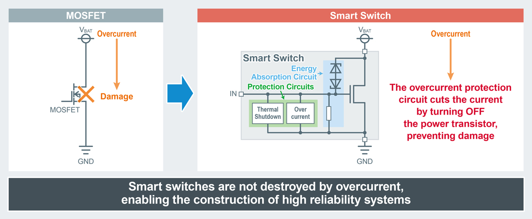 Thermally Distributed Active Clamp Control. ROHM’s original circuit and device technology that achieves both heat suppression and low ON resistance by optimally controlling the number of current-carrying channels when the power MOSFET in the smart switch generates heat due to back EMF during a turn off event.
