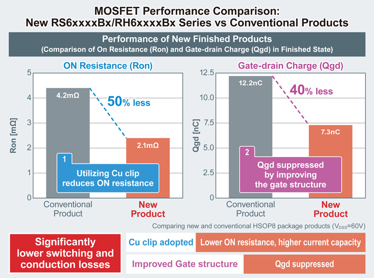 Going forward, ROHM will continue to develop MOSFETs with even lower RDS(on) that reduce power consumption in a variety of applications, contributing to solving social issues such as environmental protection through energy conservation.