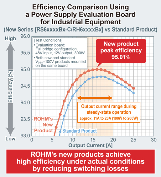 The new MOSFETs achieve an industry-leading RDS(on) of 2.1mΩ – approx. 50% lower than conventional – by increasing device performance and adopting the HSOP8/HSMT8 package featuring low-resistance copper clip connections. What’s more, improving the element gate structure reduces Qgd, which is generally in a trade-off relationship with RDS(on), by approx. 40% vs conventional products (comparing typical values for RDS(on) and Qgd for 60V HSOP8 package products). These improvements reduce both switching and conduction losses, greatly contributing to higher application efficiency. As an example, when comparing the efficiency of a power supply evaluation board for industrial equipment, ROHM’s new products achieve an industry-leading efficiency of approx. 95% (peak) in the output current range during steady-state operation.
