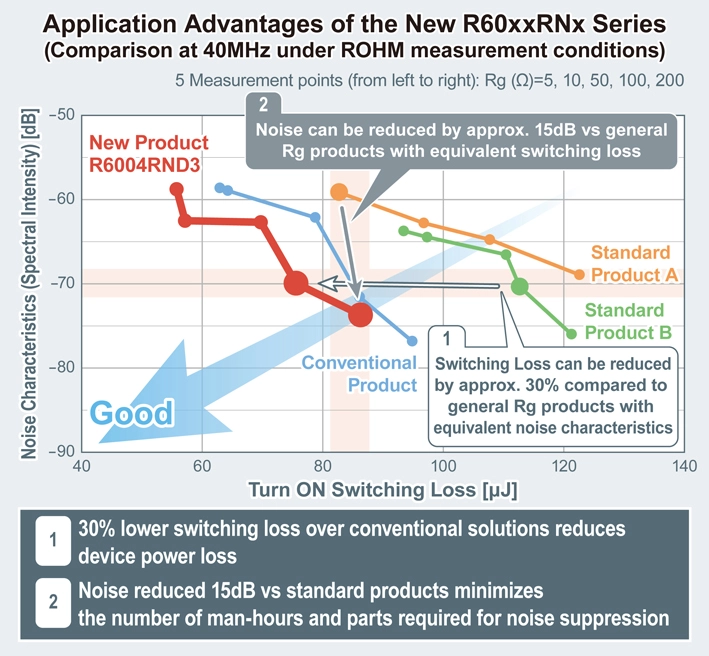 The new R60xxRNx series maintains the high-speed trr characteristics of PrestoMOS™ while minimizing noise. An industry-best trr of 40ns is achieved by improving conventional lifetime control technology, reducing switching losses by approx. 30% over general products that translates to lower application power loss. At the same time, the newly developed Super Junction structure reduces noise characteristics (which are inversely related to faster trr) by about 15dB compared to standard products (under ROHM measurement conditions at 40MHz). Delivering industry-leading characteristics reduces the number of man-hours and parts required for noise countermeasures.