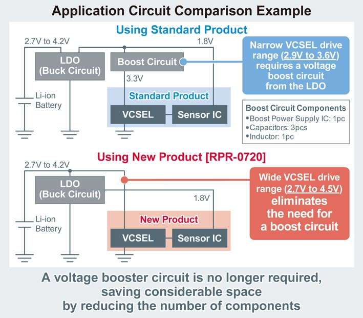 The RPR-0720 is an optical sensor module that adopts a VCSEL featuring higher directivity than LEDs as the light emitting element and a sensor IC for the light receiving element. Compact size is achieved by optimizing the module structure using in-house chips, reducing area by approximately 78% compared to conventional products. At the same time, the wide input voltage range (2.7V to 4.5V) of the built-in VCSEL eliminates the need for a peripheral voltage booster circuit (i.e. consisting of a power supply IC, three capacitors, and one inductor) when using a Li-ion battery, contributing to greater space savings that leads to smaller applications and increased battery capacity. This makes it suitable not only for sensing attachment/detachment, but also for detecting various conditions in a wide range of applications.