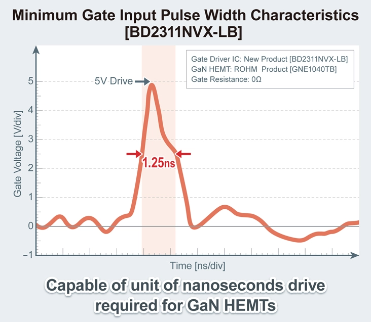 ROHM has developed a gate driver IC - the BD2311NVX-LB. It is optimized for GaN devices and achieves gate drive speeds on the order of nanoseconds (ns) - ideal for high-speed GaN switching. This was facilitated through a deep understanding of GaN technology and the continuing pursuit of gate driver performance. The result: fast switching with a minimum gate input pulse width of 1.25ns that contributes to smaller, more energy efficient, higher performance applications.