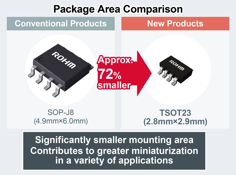 The new converter ICs deliver an output current of 1A to 3A in the compact TSOT23 package (2.8mm × 2.9mm). This reduces component area by up to 72% compared to the general SOP-J8 package (4.9mm × 6.0mm), contributing to the miniaturization of power supply blocks. On top, adopting a flip chip on lead frame TSOT23 package design enables high-efficiency operation by eliminating bond wire resistance.