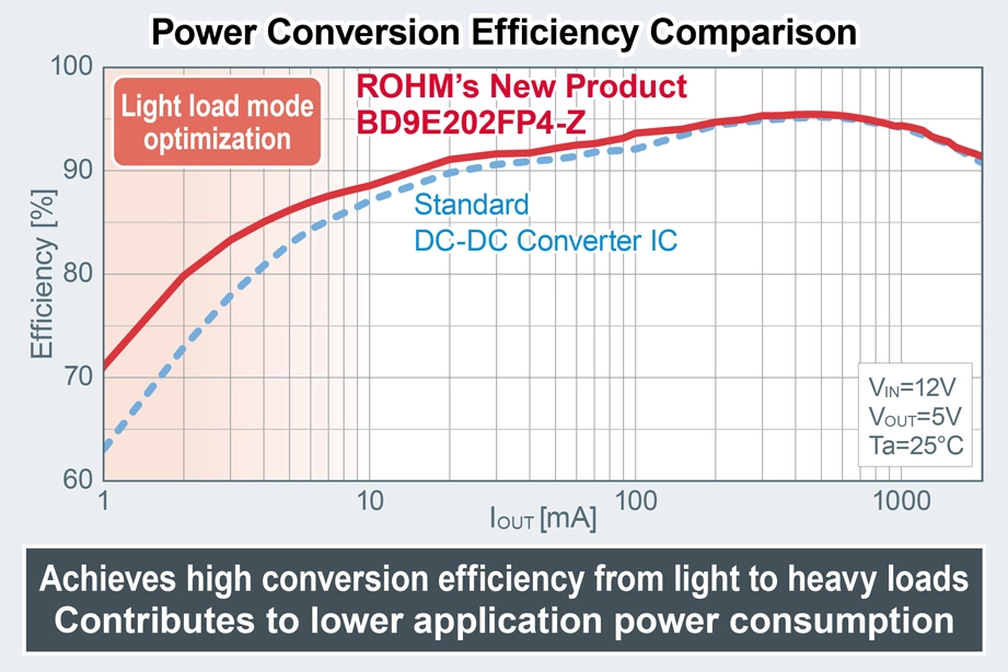 The BD9E105FP4-Z, BD9E202FP4-Z, and BD9E304FP4-LBZ also utilize a COT control mode during light load operation. As a result, efficiency during light load operation is improved over standard products, making them ideal for applications requiring low standby power consumption.