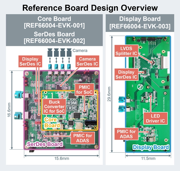 ROHM and Nanjing SemiDrive Technology Ltd., China’s largest SoC manufacturer for smart cockpits, have jointly developed a smart cockpit reference design. The design is primarily based on SemiDrive’s X9M and X9E automotive SoCs, and includes PMICs, SerDes ICs, LED driver IC, and other components from ROHM. A reference board based on this design is also available, consisting of three boards: the CoreBoard, the SerDes Board, and the Display Board.