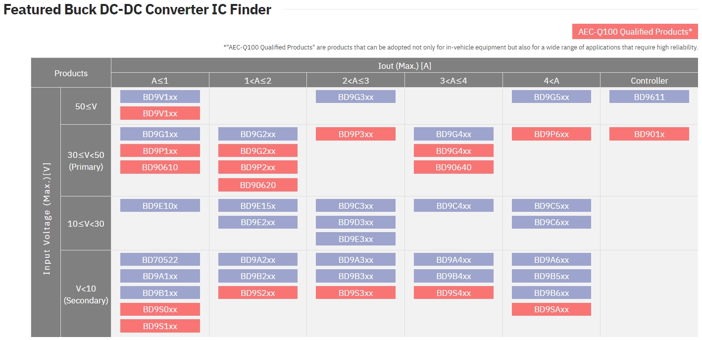 A matrix organized by Input voltage and output current allows you to easily find the recommended products immediately.