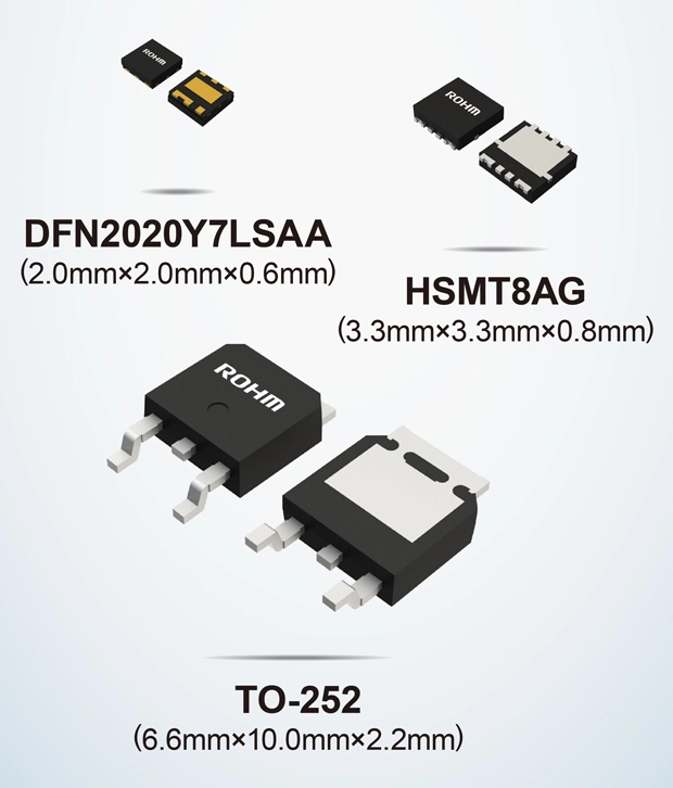 Users can select from among three package types, depending on the application. For space-constrained sets like Advanced Driver Assistance Systems (ADAS), the compact DFN2020Y7LSAA (2.0mm × 2.0mm) and HSMT8AG (3.3mm × 3.3mm) packages are ideal. For automotive power applications, the widely used TO-252 (DPAK) package (6.6mm × 10.0mm) is also available. In addition, ROHM has further enhanced mounting reliability by utilizing wettable flank technology for the DFN2020Y7LSAA package and gull-wing leads for the TO-252 package.
