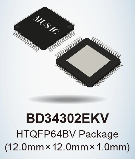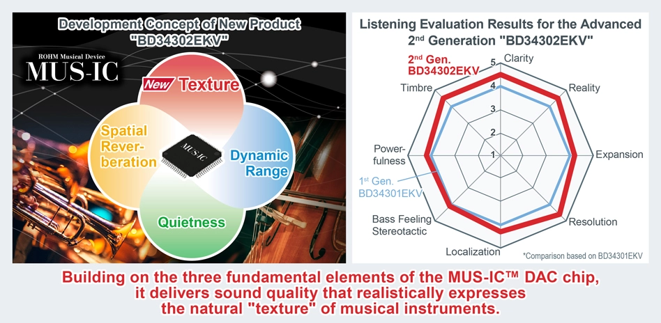 ROHM’s latest product builds on the 1st generation MUS-IC™ BD34301EKV audio DAC chip, renowned for its sound quality and widely adopted in high-end models from various companies. The BD34302EKV inherits the core design concept behind ROHM’s DAC chip — natural flat sound — and, by adding the three elements of spatial reverberation, quietness, and dynamic range from the MUS-IC™ series to authentically reproduce the “texture” of musical instruments for an even more realistic audio experience.
