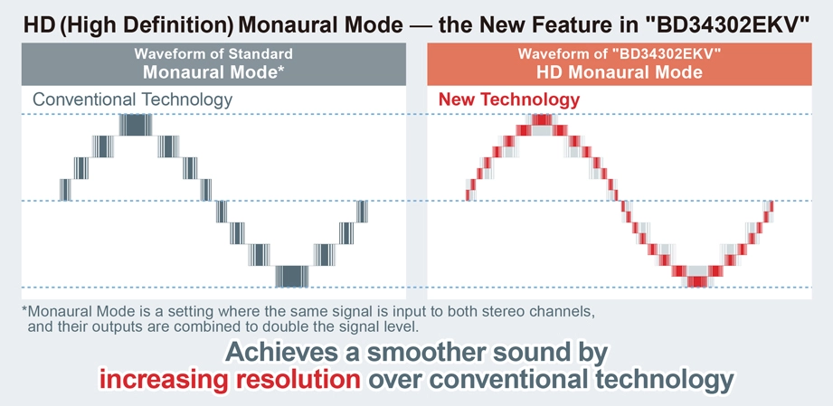 In monaural mode, which allocates one DAC chip per channel, ROHM’s proprietary HD (High Definition) monaural mode contributes to smoother, more natural sound. As part of the MUS-IC™ series, uncompromising craftsmanship has been applied down to the smallest details. Based on years of expertise in sound quality design, the optimal bonding wire material for each terminal of the BD34302EKV was selected to accurately convey the natural “texture” of musical instruments. These features help create the ideal sound sought by high-end audio manufacturers.