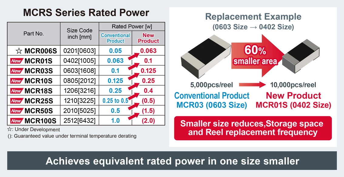 The MCRS series improves rated power and TCR (Temperature Coefficient of Resistance) characteristics by optimizing the internal structure and incorporating new materials, enabling use in a smaller size compared to conventional products. A broad lineup in sizes ranging from 0402-size (0.04inch × 0.02inch) / 1005-size (1.0mm × 0.5mm) to 2512-size (0.25inch × 0.12inch) / 6432-size (6.4mm × 3.2mm) is available, making it possible to select the ideal product based on mounting space requirements. This leads to a compact, efficient circuit design, significantly increasing design flexibility. Meanwhile, the MCRL series, a low-resistance variant of the MCRS series, is offered in sizes ranging from 0805-size (0.08inch × 0.05inch) / 2012-size (2.0mm × 1.2mm) to 2512-size (0.25inch × 0.12inch) / 6432-size (6.4mm × 3.2mm) ideal for current detection applications.
