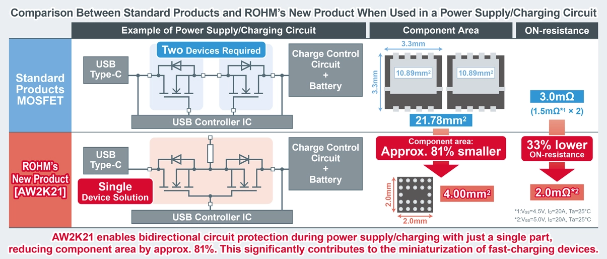 In response, ROHM developed an ultra-compact low ON-resistance MOSFET optimized for fast high-power charging. The AW2K21 adopts a proprietary structure that enhances cell density while minimizing the ON-resistance per unit chip area. Two MOSFETs are integrated into a single package, allowing a single part to support bidirectional protection applications (commonly required in power supply and charging circuits).