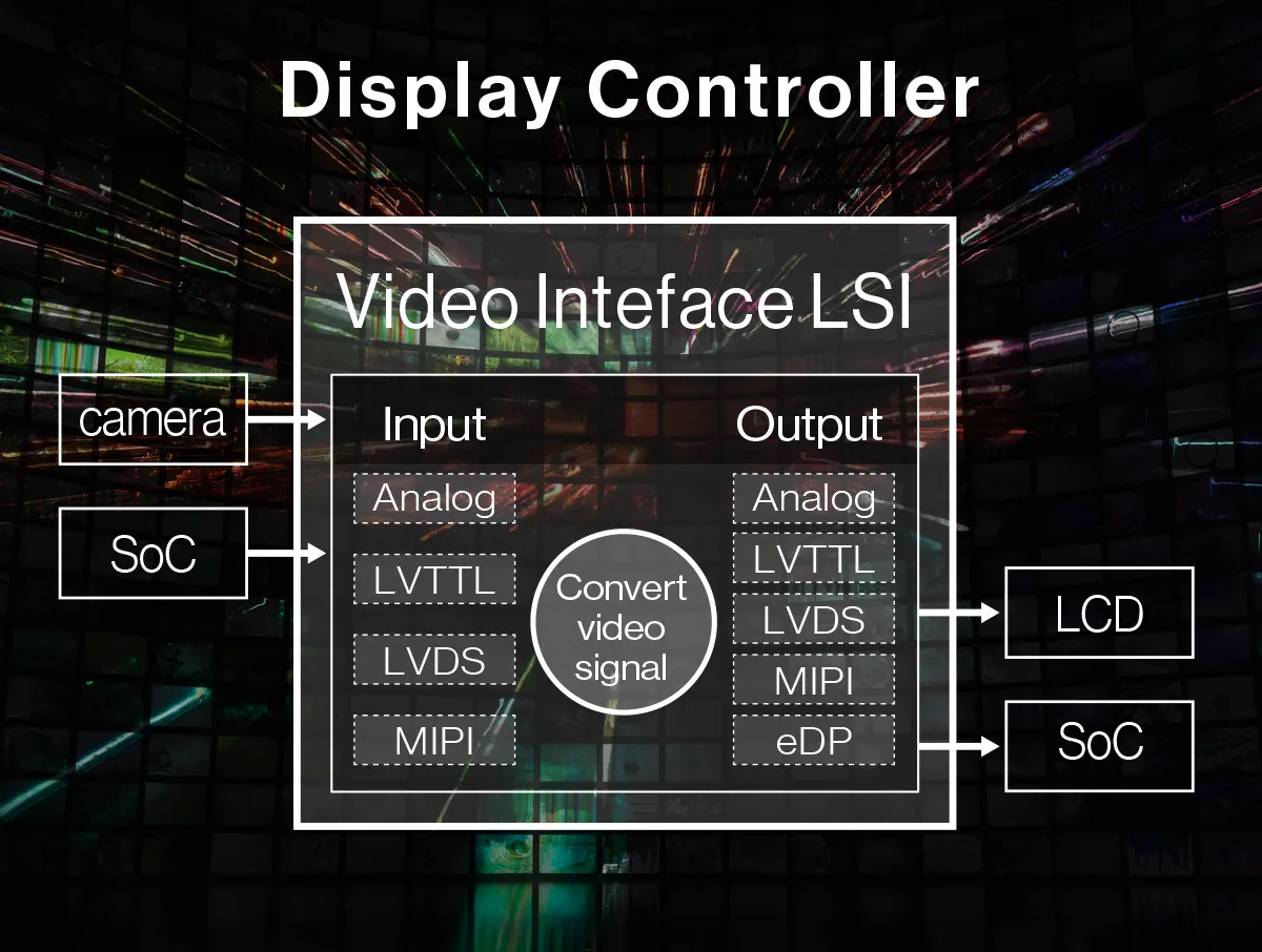 The Video interface LSI converts Analog / LVDS / MIPI signal to SoC input/output format.