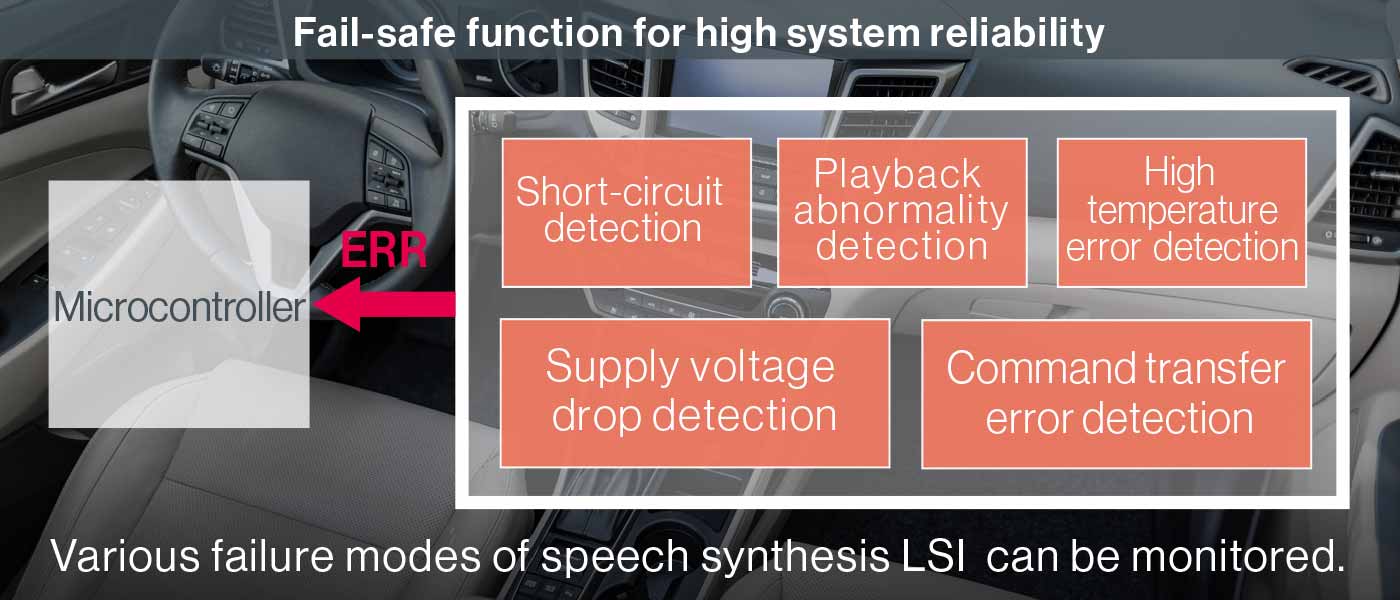 In addition, as a fail-safe function, it is equipped with functions necessary for in-vehicle applications, such as playback abnormality detection, short-circuit detection of speaker terminals, and high-temperature error detection.