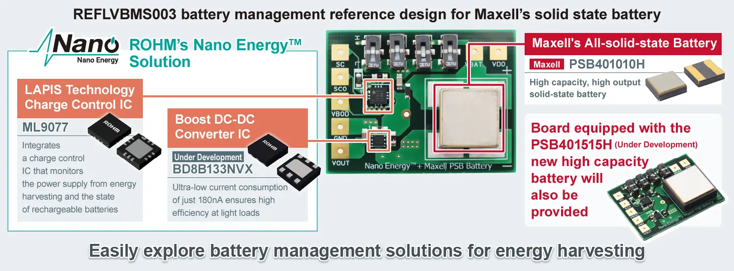 The REFLVBMS003 is a reference design that combines ROHM Group company LAPIS Technology’s charge control IC with ROHM’s original Nano Energy™ ultra-low current power supply IC and Maxell’s all-solid state batteries (PSB401010H / PSB401515H (Under Development)). This novel solution with integrated battery and power supply blocks allows for a wide range of combinations using various energy harvesting methods.