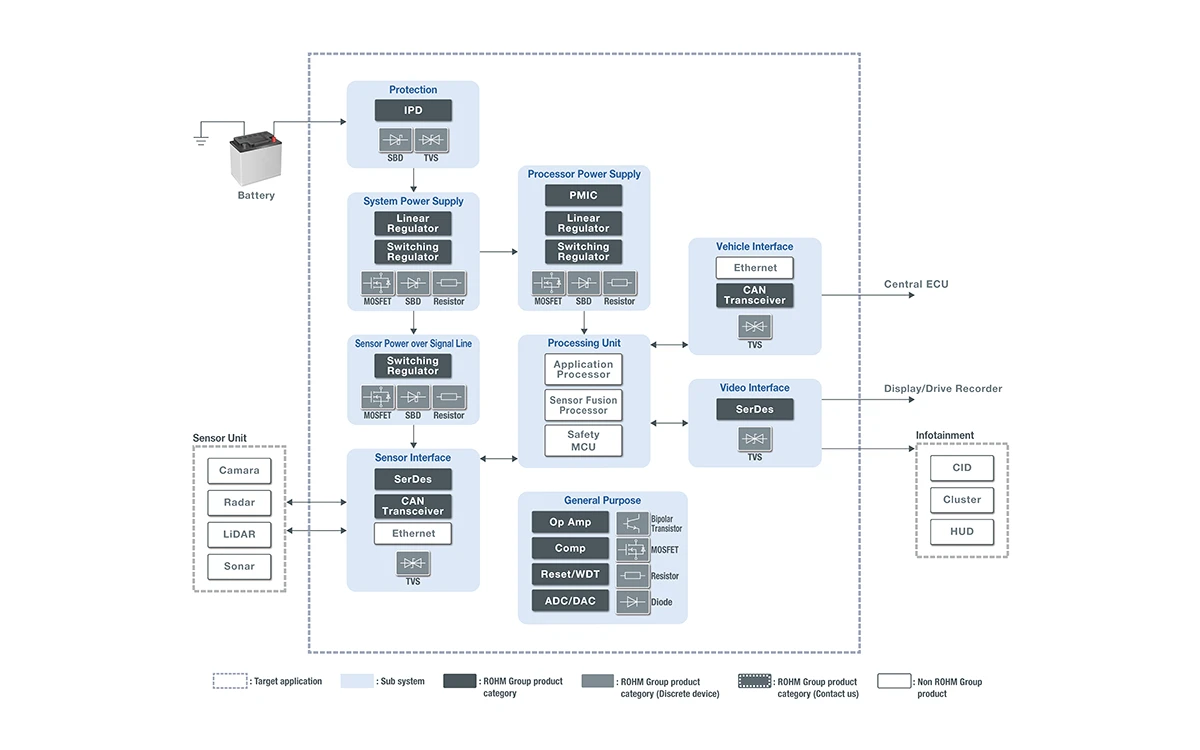 To meet these demands, ROHM offers a wide selection of power supply ICs and discrete components designed to ensure reliable system operation, contributing to the advancement of autonomous driving technologies and improved overall vehicle safety.