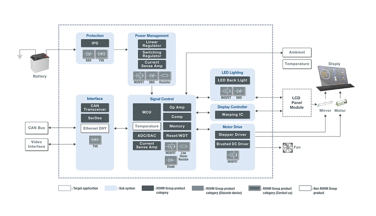 ROHM offers a broad lineup of compact products, such as resistors, discrete semiconductors, and ICs, including stepper motor drivers for HUDs that ensure functional safety with low-consumption, contributing to greater energy efficiency and miniaturization in HUDs.