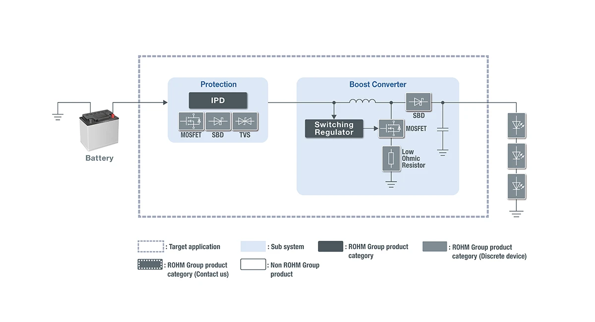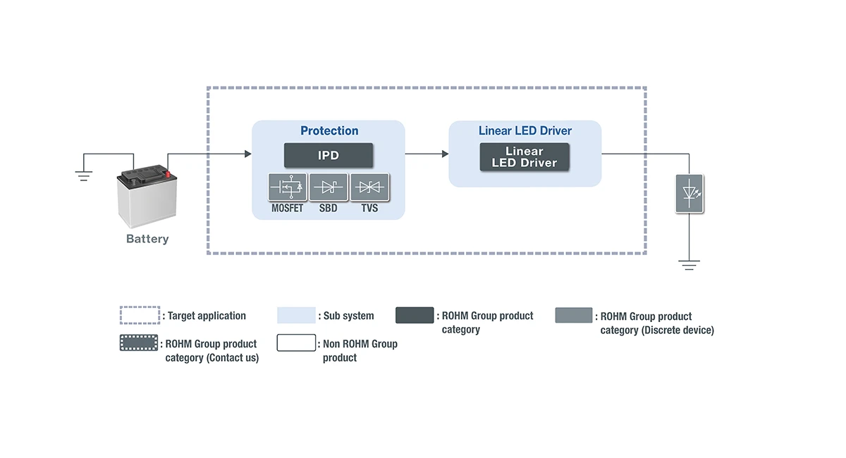 ROHM supports these demands with a comprehensive lineup that includes both linear and switching LED drivers along with peripheral components such as MOSFETs and intelligent power devices (IPDs) that facilitate efficient, compact, and high reliability fog lamp system designs.