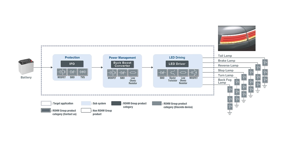 ROHM offers high performance LED driver ICs that comply with functional safety standards, making it possible to improve the reliability of rear lamps.