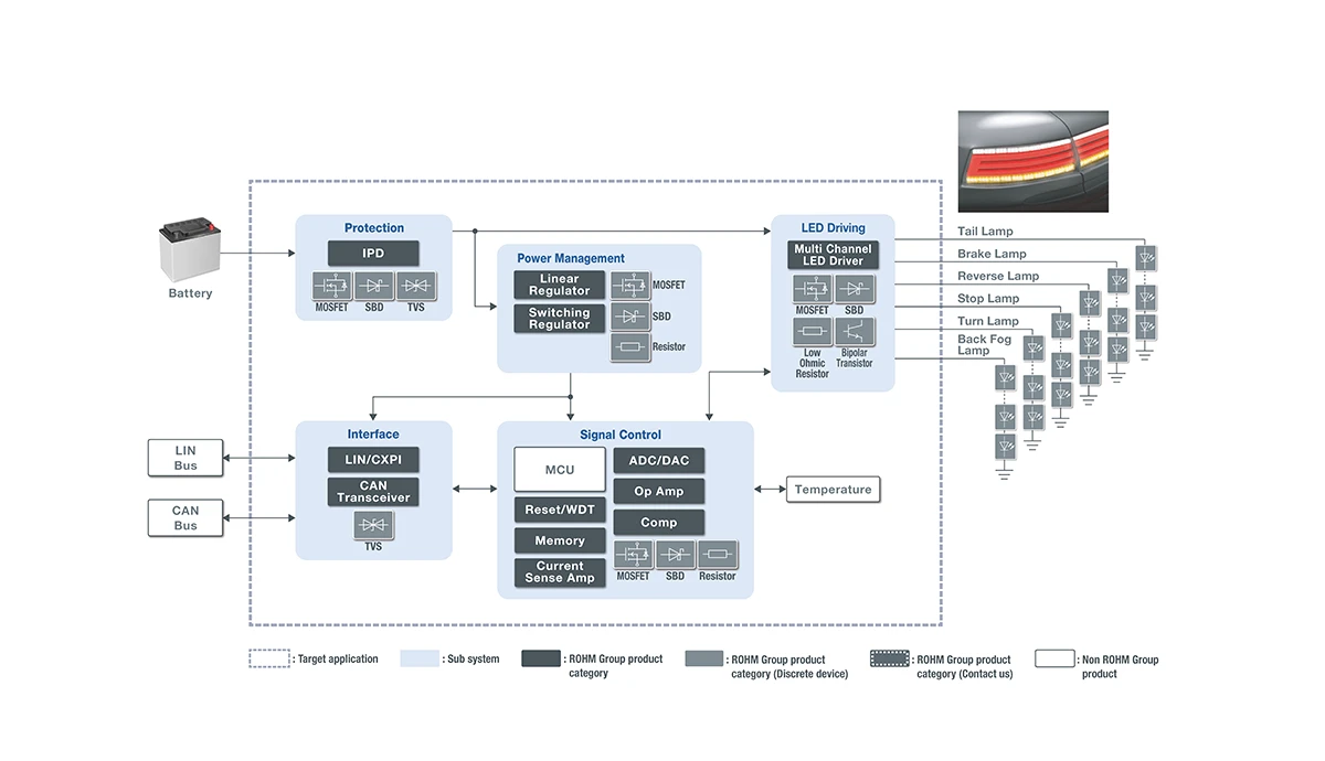 ROHM offers high performance LED driver ICs compliant with functional safety standards that contribute to improving the reliability of rear lamps.