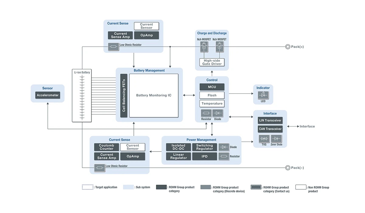 ROHM helps improve BMS performance through MCUs, power supply ICs, cell balancing FETs, and high accuracy current detection solutions.