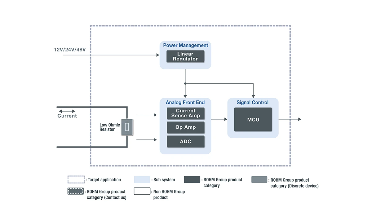 For methods that measure the voltage drop across a shunt resistor, ROHM offers high-accuracy current sensing solutions using high heat dissipation shunt resistors, high-accuracy current sense amplifiers, and precision operational amplifiers.