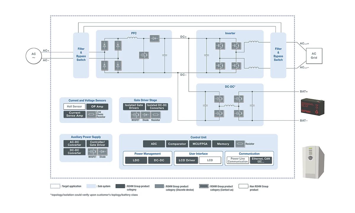 ROHM supports the development of robust power supply systems by offering a broad portfolio of power semiconductors and circuit topologies suitable for applications ranging from compact UPS units to large-scale 100kVA systems.