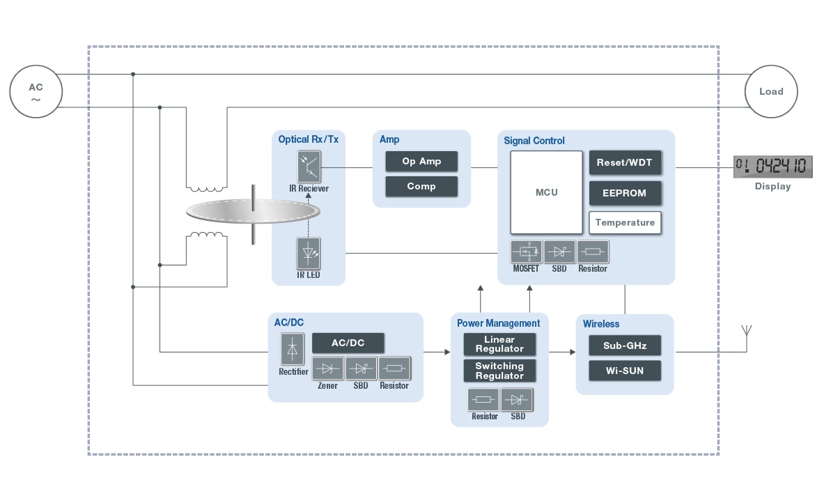 In today’s era of tight power supply and demand, devices such as smart meters are needed that allow users and power companies to achieve effective power management by accurately measuring power usage over the long term while integrating security and communication functions. ROHM enables data measurement and power efficiency optimization with high reliability op amps, low consumption power supply ICs, and wireless communication devices.