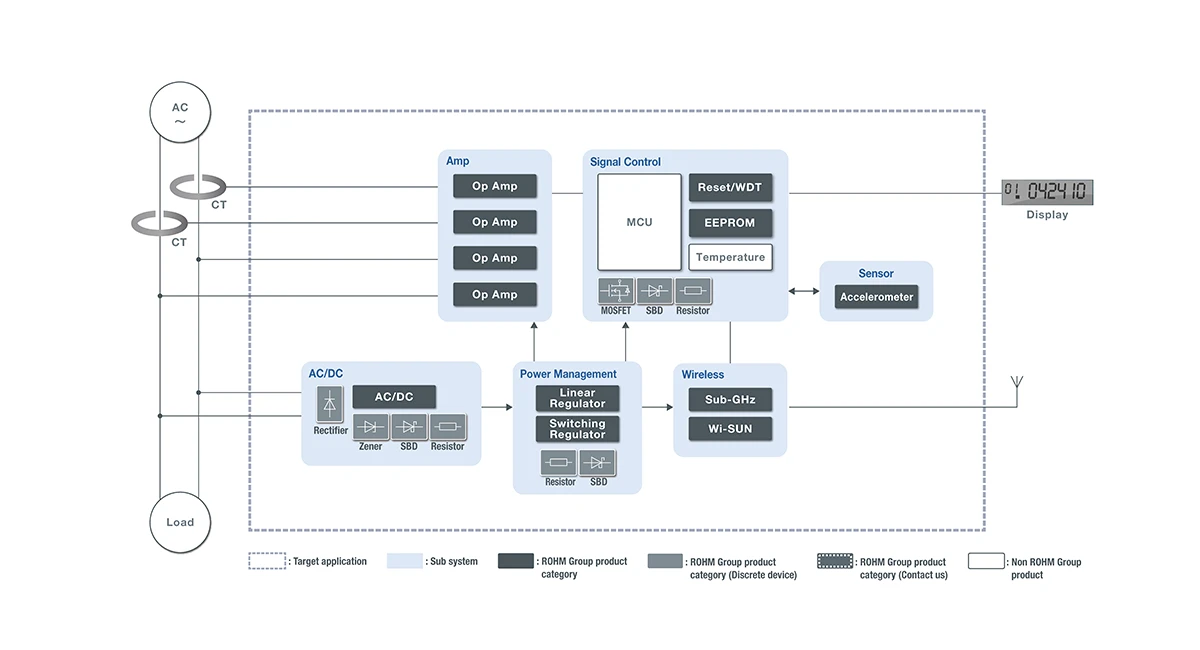 ROHM supports these requirements by providing high-precision operational amplifiers for current sensing, energy efficient power supply ICs, and wireless communication devices, contributing to greater measurement accuracy and optimized power efficiency.