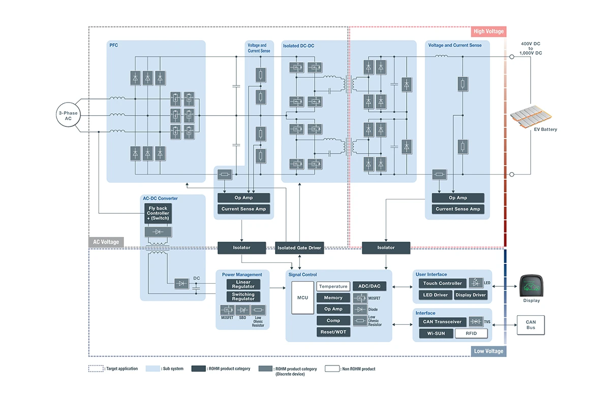 ROHM supports this by offering solutions such as power semiconductors and driver ICs centered on SiC devices while improving charging efficiency through high accuracy current sensing using shunt resistors and current detection amplifiers.