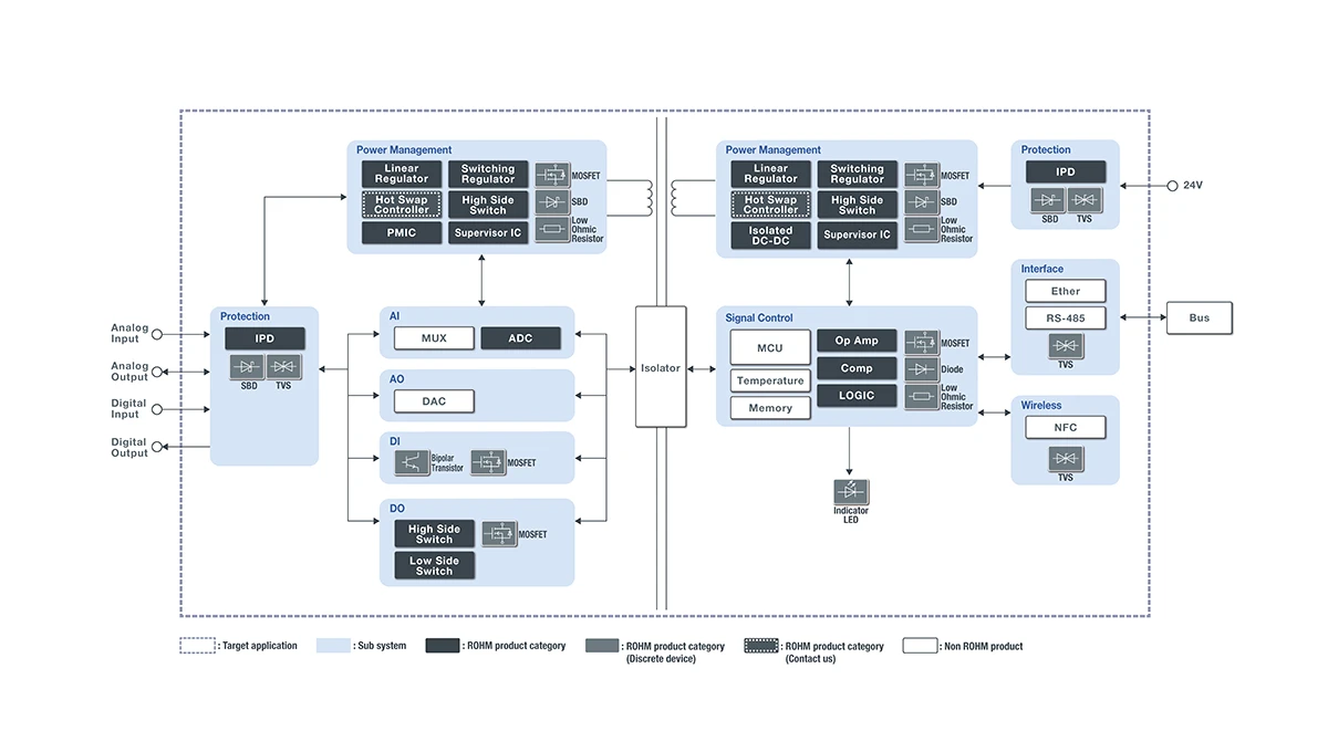 ROHM supports these demands by providing high-efficiency power supply ICs optimized for input/output units, IPDs with integrated protection circuits, and a variety of signal processing ICs, enhancing overall reliability and noise immunity.