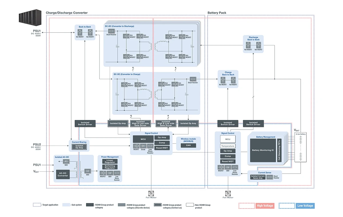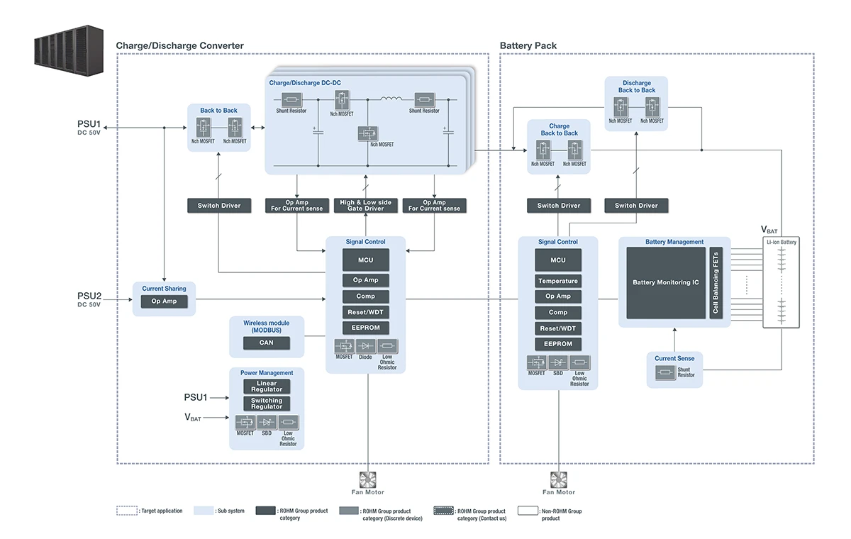 First, designing battery backup units (BBUs), which protect data in the event of a power supply failure, requires high-level battery management to maximize the performance of lithium-ion batteries. ROHM provides products such as remaining battery level monitoring ICs (fuel gauge ICs) that can assess even the state of health (SoH) of batteries highly precisely, contributing to downsizing and improving the reliability of the BBUs.