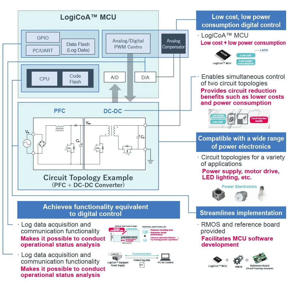 ROHM has released LogiCoA™ solutions for the power electronics sector, blending analog and digital control to deliver functionality comparable to high-end, fully digital systems while maintaining the low power consumption and cost efficiency of analog designs.