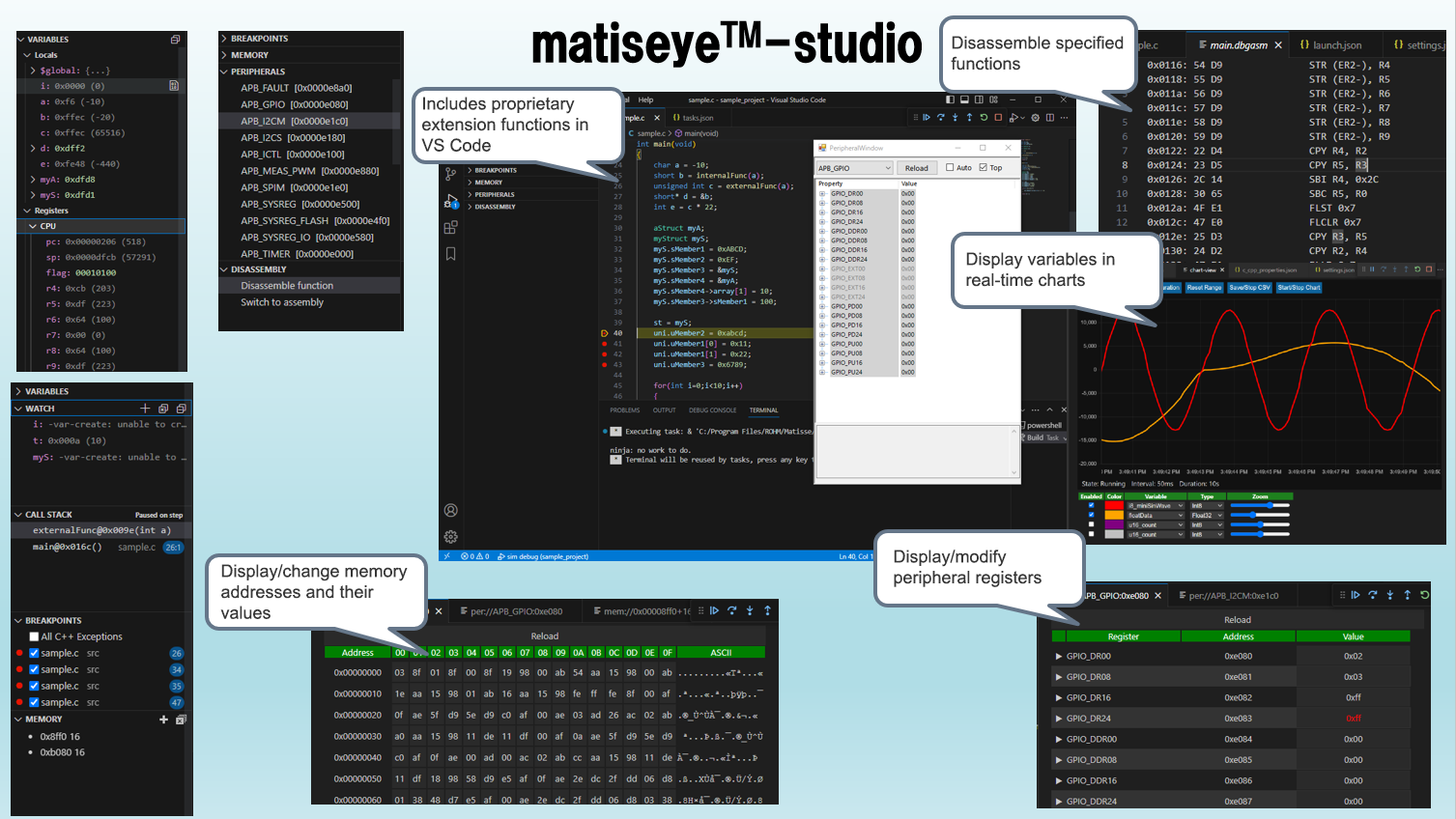 matiseye™-studio is an integrated development environment (IDE) for Matisse written in C that incorporates ROHM’s proprietary extension functions into Visual Studio Code (VS Code), an open-source code editor developed by Microsoft® . matiseye™-studio includes debugging capabilities such as memory monitoring, peripheral register management, real-time variable watching, and disassembly, providing robust support for customer software development.
