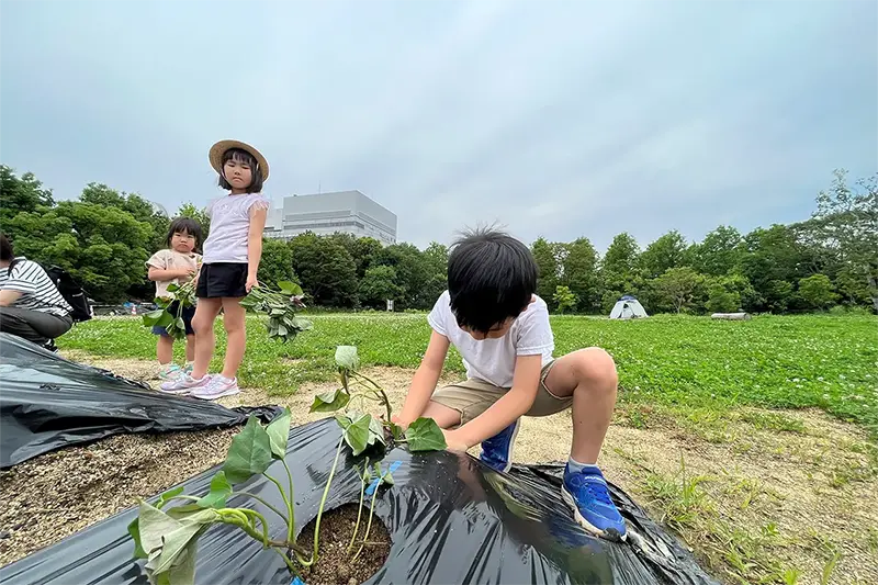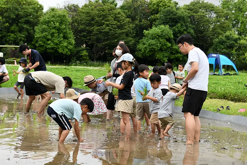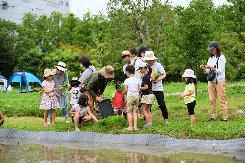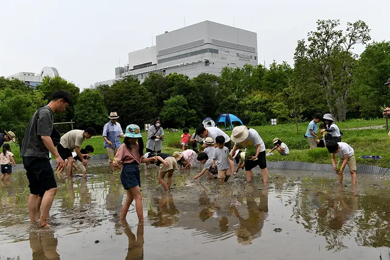 ROHM held a rice and potato Seedling planting event in the biotope area at ROHM Head Office