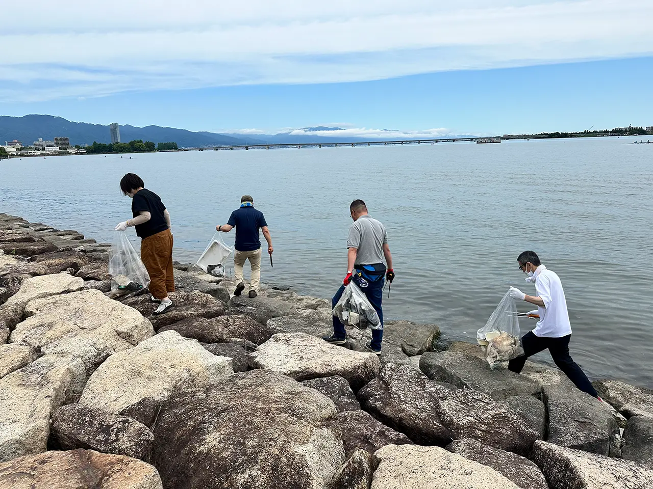 On June 25, 2023, 19 employees of the Shiga Plant and their families participated in a cleanup of Lake Biwa organized by Otsu City as part of our SDGs efforts.