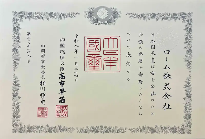 On March 23, 2026, a conferment ceremony was held at ROHM’s headquarters, where a certificate of commendation was presented by the Shiga Prefectural Government.